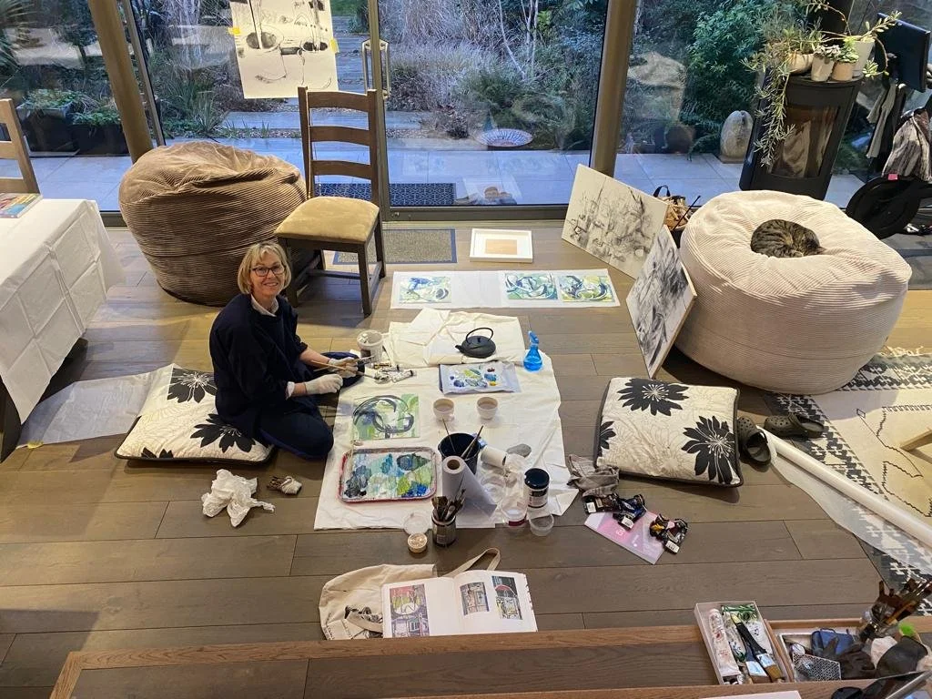 My work has evolved through photography, drawing and watercolours, and slowly through every available medium. Photographs are still a big part of my work, as are paintings of domestic scenes, and treasured found objects. Now I am finally able to work on a larger scale in my studio, and make collages.